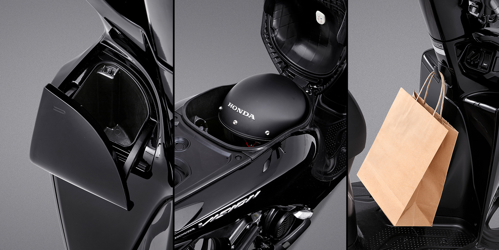 수납을 더 편리하게작은 물건을 보관하기 좋은 프런트 이너 박스와 풀 페이스 헬멧 1개를 넣을 수 있는 러기지 박스, 쇼핑백을 걸 수 있는 러기지 후크가 있어 수납이 편리합니다. (단, 러기지 박스의 경우 헬멧의 사이즈와 형태에 따라 수납이 불가능한 경우도 있습니다.)