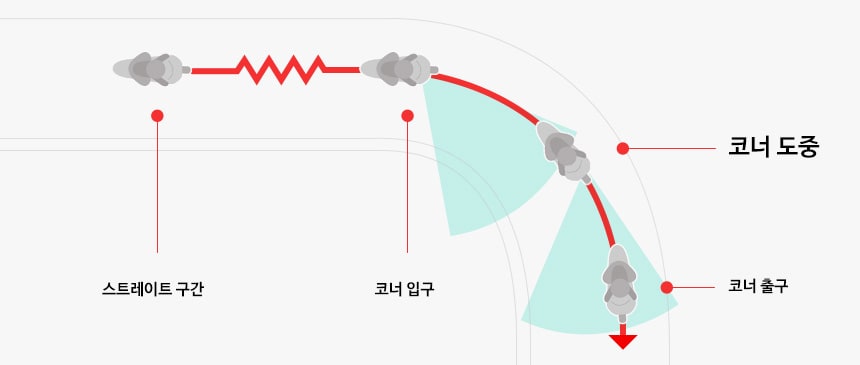 코너링 철칙! 코너 전에 충분히 스피드를 낮춥니다!