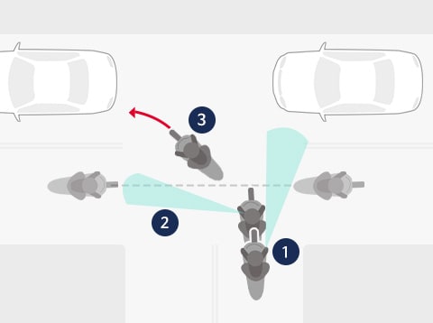 자동차의 사각에 들지 않는 위치를 생각하는 것은 물론, 전방의 자동차가 급격한 진로변경을 해도 반응할 수 있는 차간거리를 유지하고, 앞 차량의 룸미러와 백미러에 자신의 바이크가 비춰지는지 등 자신의 존재가 상대에게 알려지는 위치를 생각하면서 주행할 필요가 있습니다.